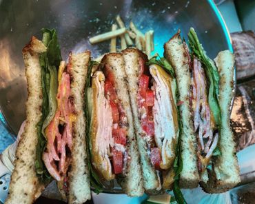 double decker, bacon, ham, turkey, tomato, cheddar, lettuce, roasted garlic aioli